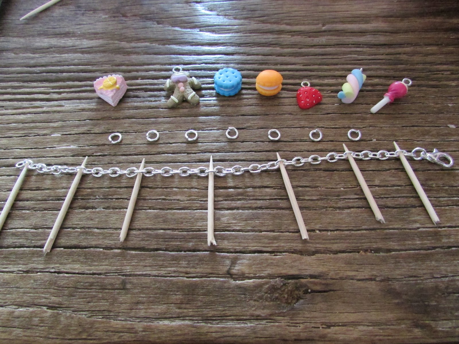 - Définissez l’espacement des breloques (ici à l’aide de cure-dents).